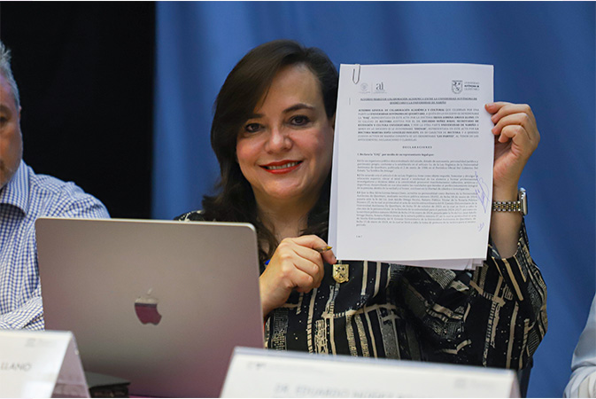 Durante la ceremonia inaugural, las funcionarias universitarias de la UAQ y la Universidad de Nariño (UDENAR), Colombia, signaron un acuerdo de colaboración que representa el inicio de una agenda conjunta de trabajo e intercambio académico y cultural. La rectora de la UAQ, Dra. Silvia Amaya Llano, destacó que este esfuerzo permitirá fortalecer la cooperación y abrir nuevas oportunidades para estudiantes, docentes e investigadores.