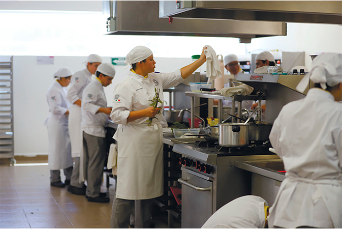 Esta dinámica es parte del proceso formativo de las y los chefs, pues cada semana deben hacer preparaciones que utilicen los procedimientos revisados en clase; además, el aula cocina —instalada en el campus Aeropuerto— funciona como la de cualquier restaurante, con sus respectivos liderazgos, comandas y ajetreo, lo que les prepara para ejercer en el campo laboral.