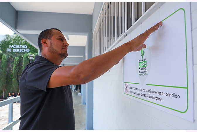 Con el propósito de salvaguardar la salud de la comunidad la Facultad de Derecho (FDe) de la Universidad Autónoma de Querétaro (UAQ), así como de quienes visitan estas instalaciones, la Institución trabaja para convertirse en un espacio libre de humo de cigarro y emisiones derivadas de productos que calientan o vaporizan esa materia prima y otras sustancias.