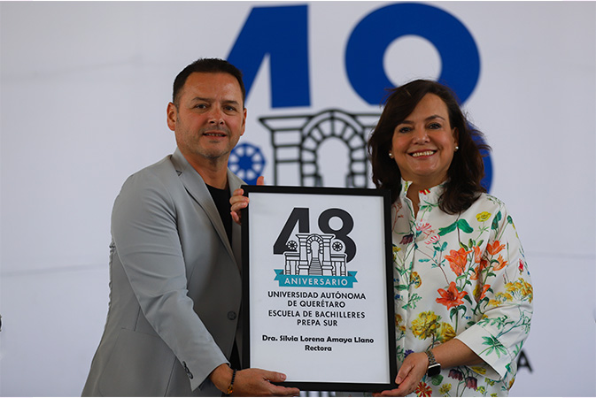 Con una sólida trayectoria educativa en el estado, el plantel Sur de la Escuela de Bachilleres (EB) de la Universidad Autónoma de Querétaro (UAQ) —fundado el 05 de septiembre de 1977— celebró 48 años de historia con una emotiva ceremonia presidida por la rectora de la UAQ, Dra. Silvia Amaya Llano y el director de la EB, Mtro. Anghellus Medina López, quienes estuvieron acompañados por exalumnas, exalumnos docentes insignes y la actual comunidad estudiantil.